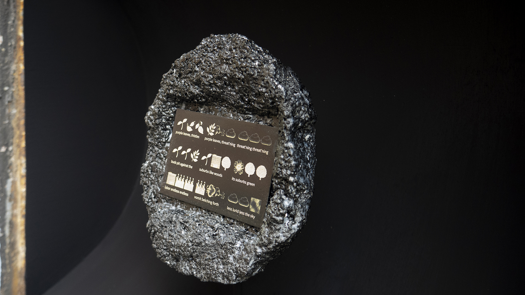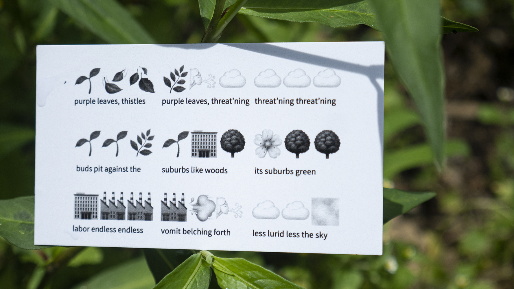 The Chute displayed: 1) a poem translated into both emoji and text, using hyperlocal air quality data and poems from Ernest Howard Crosby’s 1905 book Broad-Cast, etched onto metal and embedded into a locally-gathered lump of petroleum coke and 2) calling cards with the poem, and directions to subscribe to daily emoji poems translating hourly air quality readings.