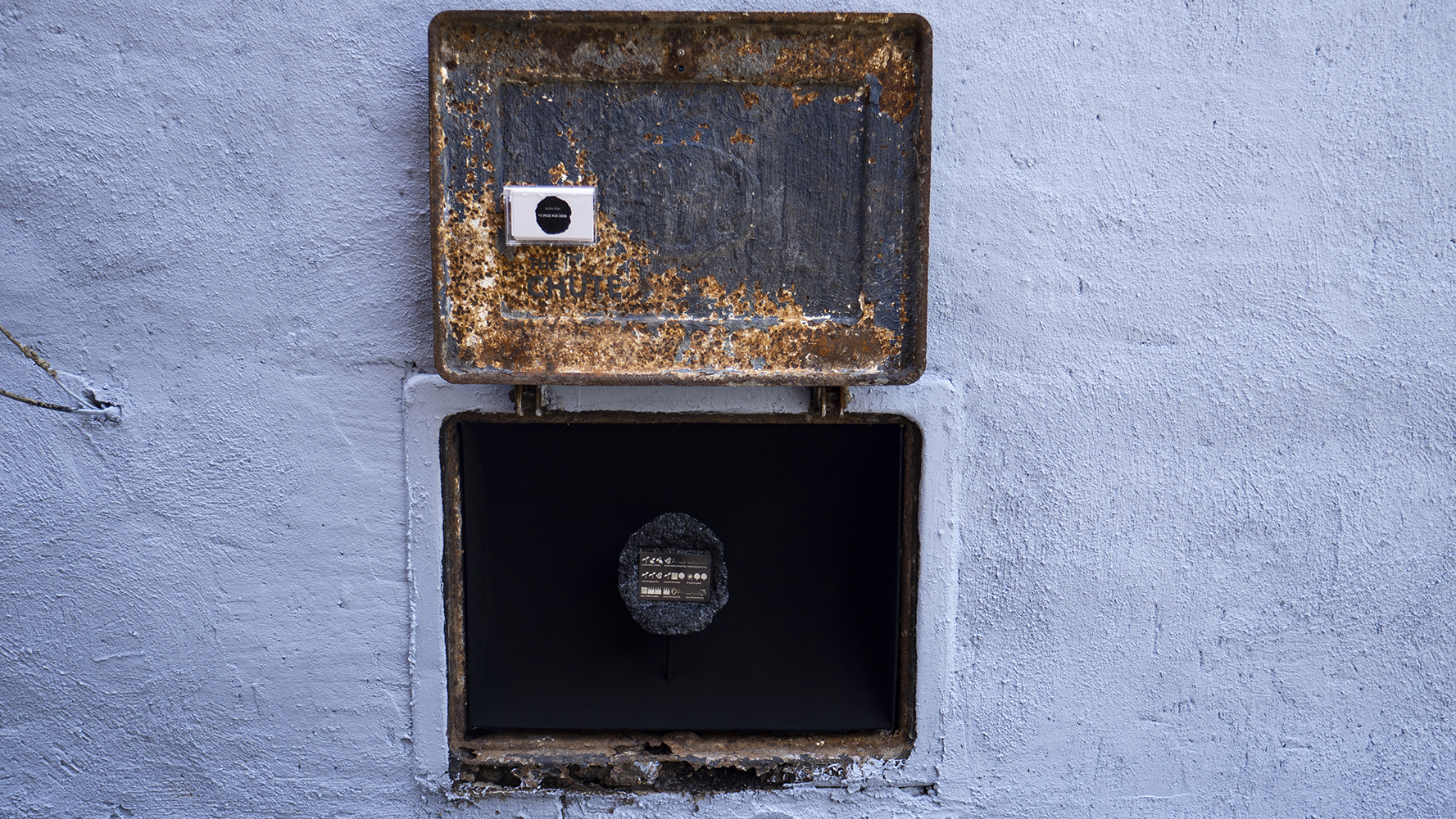 The Chute displayed: 1) a poem translated into both emoji and text, using hyperlocal air quality data and poems from Ernest Howard Crosby’s 1905 book Broad-Cast, etched onto metal and embedded into a locally-gathered lump of petroleum coke and 2) calling cards with the poem, and directions to subscribe to daily emoji poems translating hourly air quality readings.